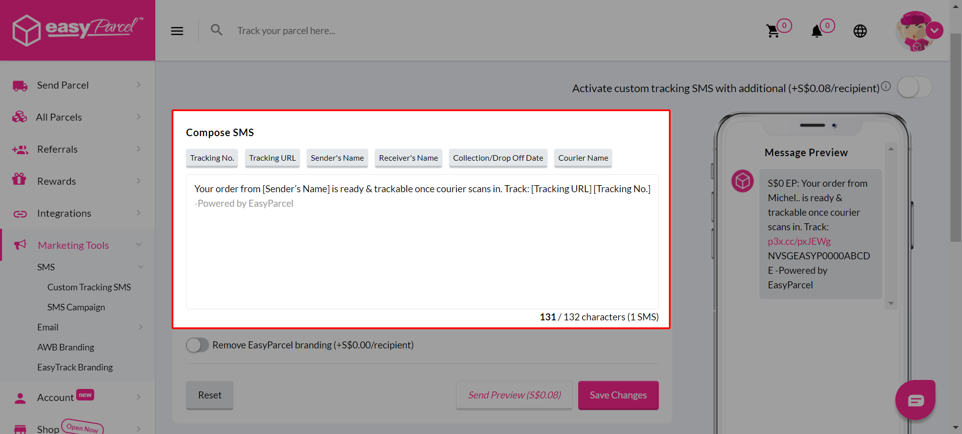 Step 3: You can choose to remove EasyParcel branding (+S$0.00/recipient) and “Save Changes”.
