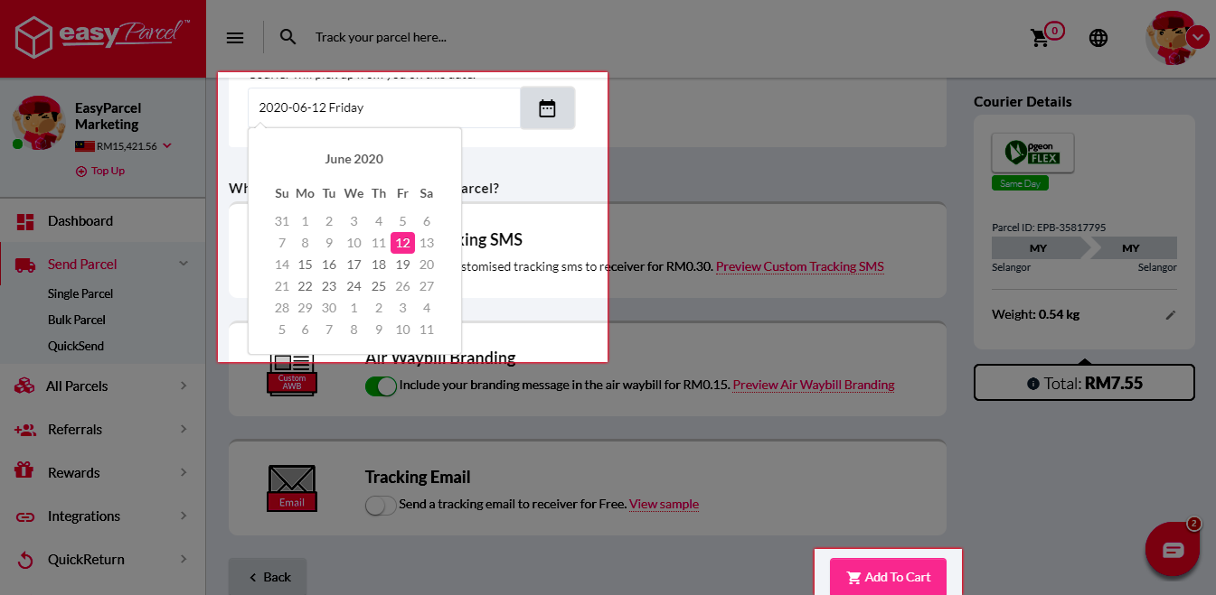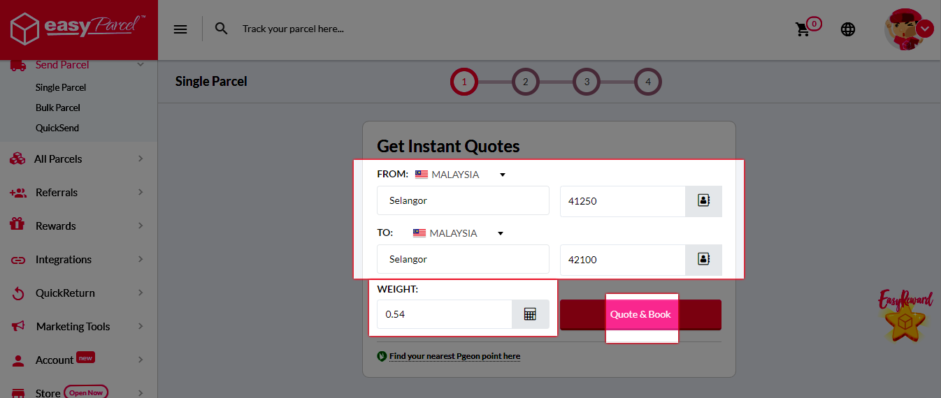 Step 2: Key in the postcodes and the weight of your parcel.