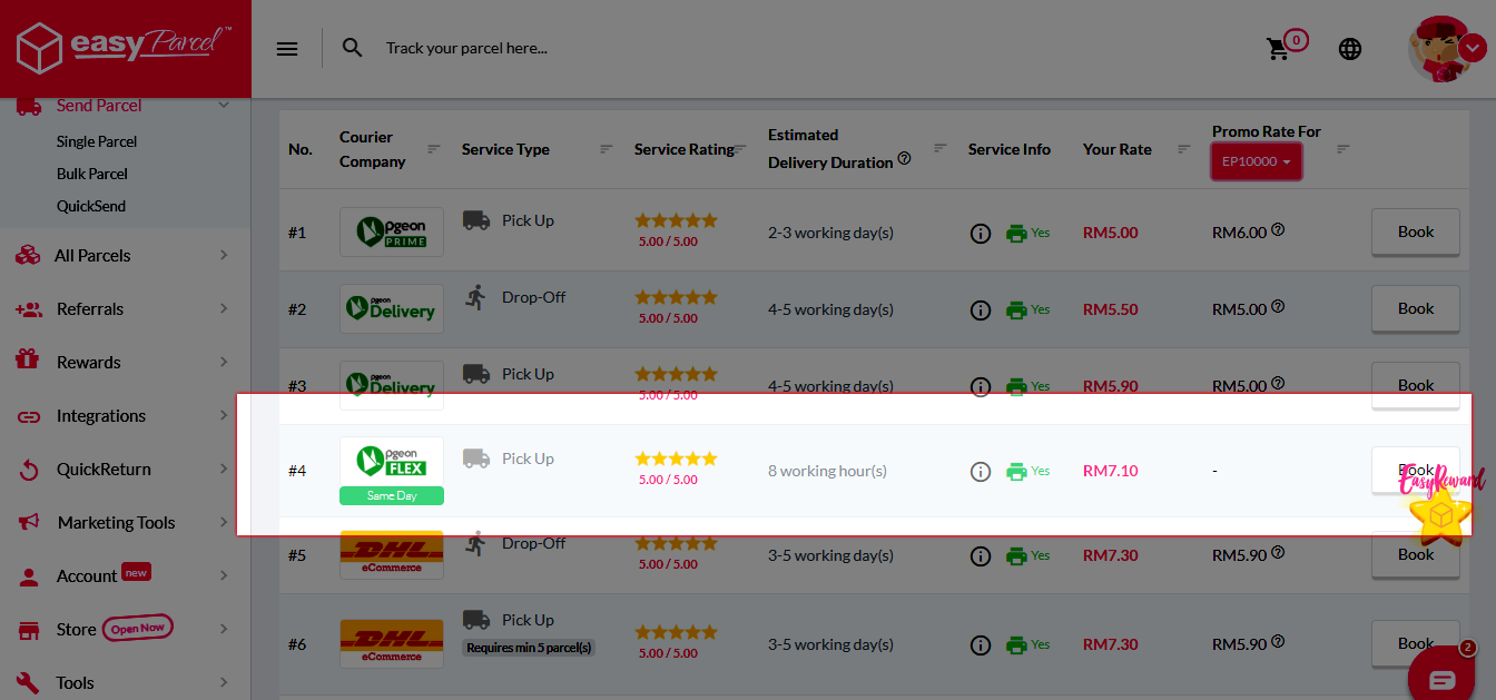 Step 3: Select whichever on-demand courier at your preference with a click on "Book" button.