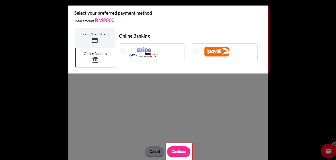 Step 3: Select your preferred payment method: credit/debit card, online banking or e-wallet, and then proceed with a click on the "Continue" button.