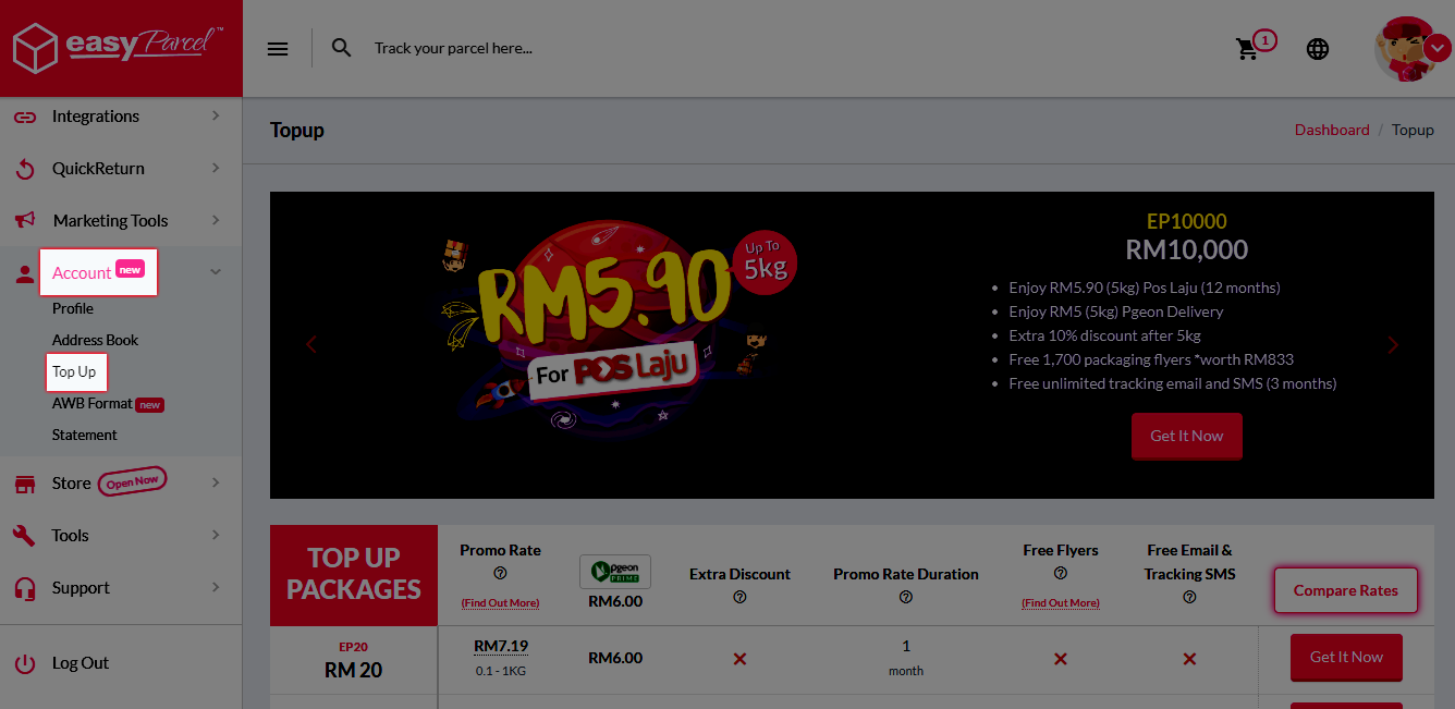 You can top up your EasyParcel credit directly in just a few clicks online and enjoy member rates for your deliveries. This online top up available across multiple methods, including credit/debit card, online banking and e-wallet. Find out how you can top up online:-